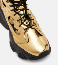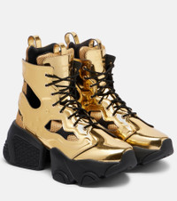 Look to Noir Kei Ninomiya for sleek design with a futuristic flair, like these glossy lace-up boots. The metallic pair comes with side cutouts, mesh paneling, and cushiony platform soles. Product Details - Upper: fabric, rubber - Lining: fabric - Sole: fabric insole, rubber sole - Toe shape: round toe - Made in China - Includes: shoe box - Designer color name: Gold - Item color: gold - Closure: lace-up - Item number: P01132152 Size & Fit - True to size - Half sizes please take the next size up - US sizes - 8cm-3" heel (size EU 38) - 4,5cm-2" platform (size EU 38)