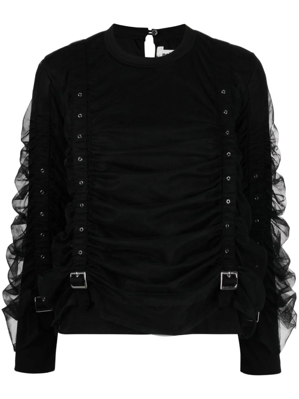panelled buckled cotton blouse Highlights - Black - Cotton - Semi-sheer panels - Panelled design - Decorative buckle detailing - Ruched detailing - Silver-tone hardware - Crew neck - Single rear button fastening - Long sleeves - Curved hem Imported Composition Cotton 100% SIZE & FIT Model measurements Height 5 ft 10 in(1.77 m) Bust/Chest 31.49 in(80 cm) Hips 35.43 in(90 cm) Waist 25.19 in(64 cm) FittingInformation Designed for a slim fit that sits just away from the body offering a close yet comfortable fit The belt offers adjustability for fitted preferences Made from a midweight non-stretch fabric, this piece offers minimal elasticity when worn This piece fits true to size – take your usual size Washing instructions Dry Clean Only