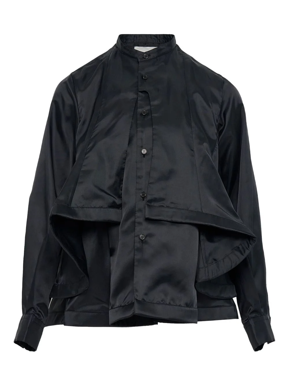 ruffled-layer twill shirt Highlights - Black - Layered ruffles - Long sleeves - Button fastening - Mock neck Imported Composition Polyester 100% Washing instructions Read Manufacturer Guidelines