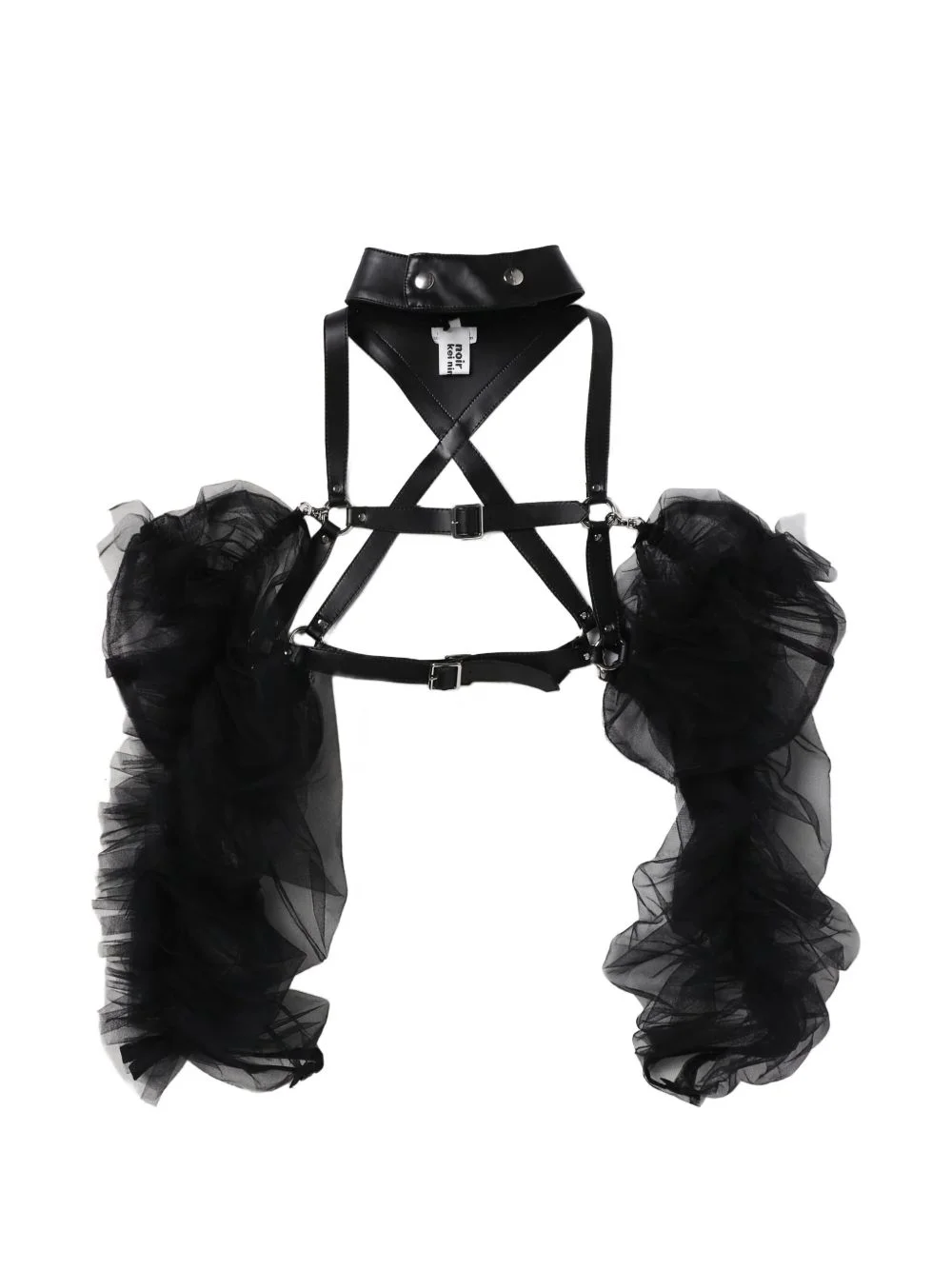 ruffled harness Highlights - Black - Buckle fastening - Ruffle detail - Harness style - Silver-tone hardware Imported Composition Polyurethane 100%, Mesh 100% Washing instructions Read Manufacturer Guidelines
