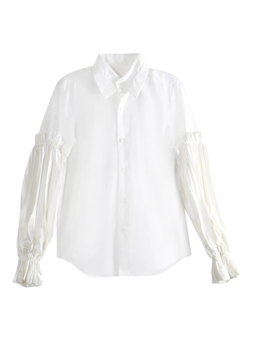 ruffled-sleeve shirt Highlights - White - Button fastening - Long sleeves - Ruffled cuffs - Pleated detail - Point collar Imported Composition Cotton 100% Washing instructions Read Manufacturer Guidelines