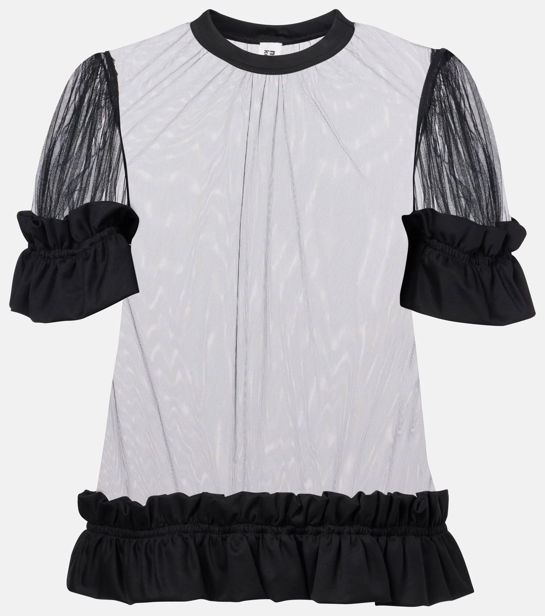 Layered in sheer panels or gathered in frothy ruffles, tulle is the perfect medium for Noir Kei Ninomiya’s expressive designs. A prime example, this top features ruffled sleeves and hemline. Product Details - Material: 100% nylon - Care instructions: dry clean - Made in Japan - Designer color name: Black - Item color: black - Trim: 100% cotton - Collar: crewneck - Item number: P01069049 Size & Fit - True to size - Sheer - Straight fit - Partly stretchy fabric - Falls to the hip - The model seen in the picture is 178cm-5'10" and wearing a size XS