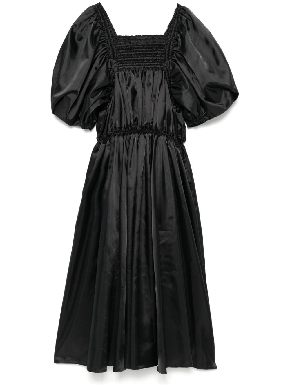 smocked midi dress Highlights - Black - Satin finish - Twill weave - Smocked panel - Square neck - Short puff sleeves - Pleat detailing - Two side inset pockets - Elasticated waistband - Tiered skirt - Mid-length Imported Composition Polyester 100%