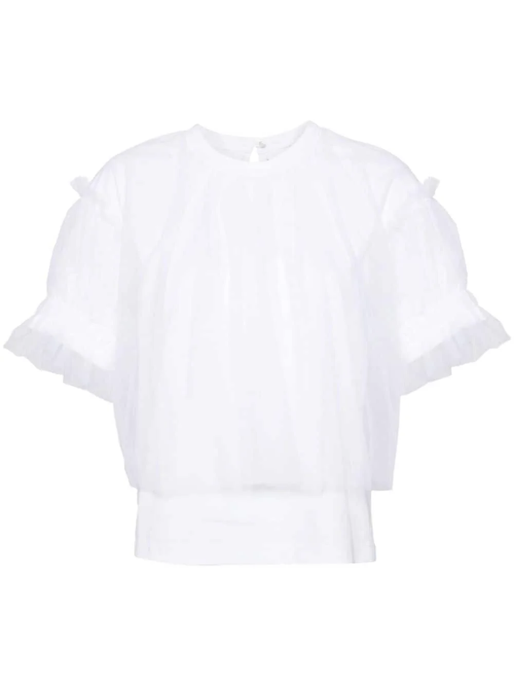 tulle-sleeved T-shirt Highlights - White - Cotton - Tulle overlay - Gathered detailing - Elasticated cuffs - Crew neck - Short sleeves - Straight hem Imported Composition Cotton 100% SIZE & FIT Model measurements Height 5 ft 10 in(1.77 m) Bust/Chest 27.95 in(71 cm) Hips 34.64 in(88 cm) Waist 22.83 in(58 cm) FittingInformation Designed to be unstructured, offering a loose fit throughout Made from a midweight non-stretch fabric, this piece offers minimal elasticity when worn