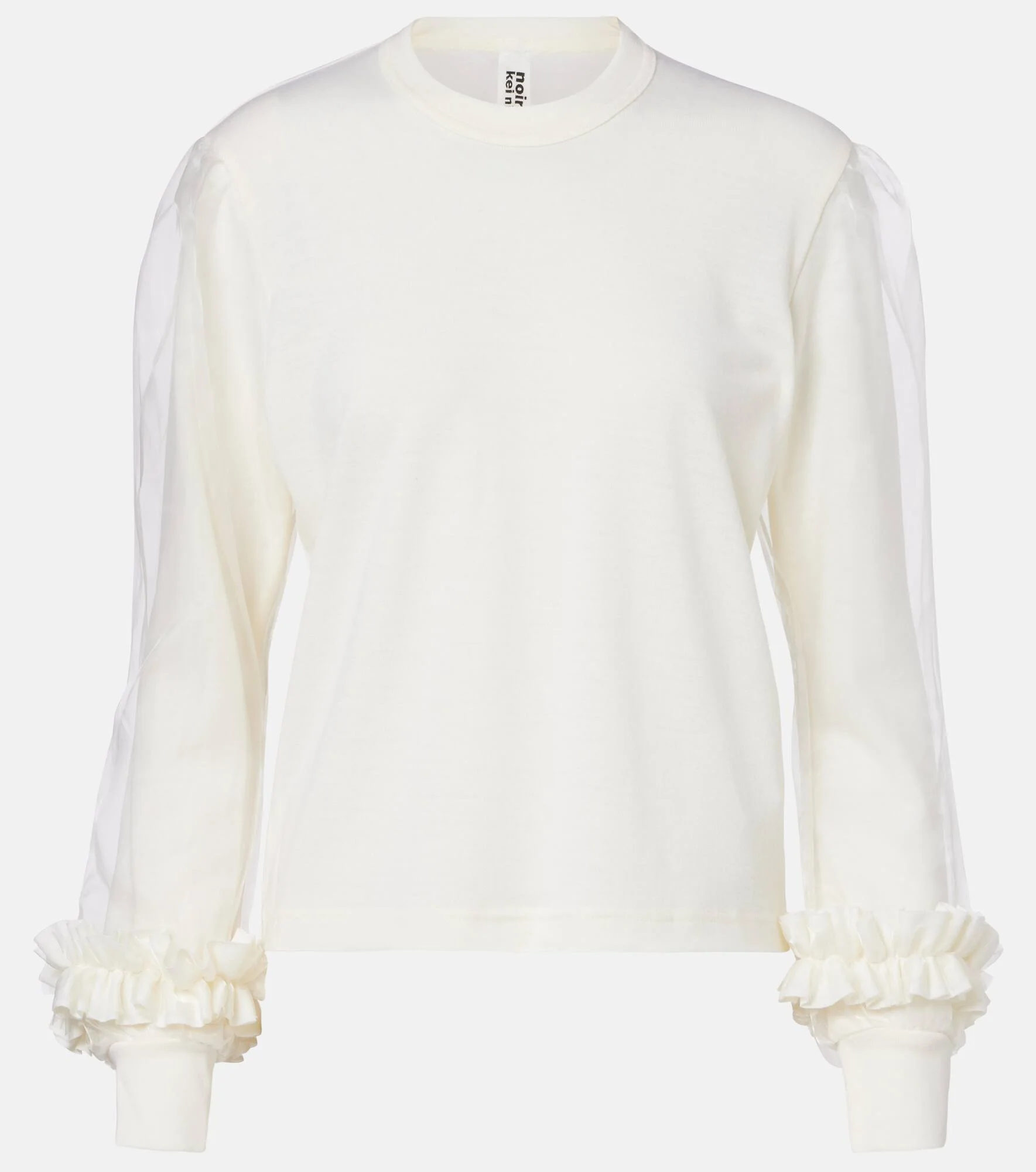 This classic wool sweater is reinvented with ruffles and tulle trims at the sleeves. Layered in sheer panels or gathered in frothy ruffles, tulle is the perfect medium for Noir Kei Ninomiya’s expressive designs. Product Details - Material: 100% wool - Care instructions: dry clean - Made in Japan - Designer color name: Off White - Item color: white - Collar: crewneck - Item number: P01100422 Size & Fit - True to size - Straight fit - Partly stretchy fabric - Falls to the hip - The model seen in the picture is 178cm-5'10" and wearing a size XS