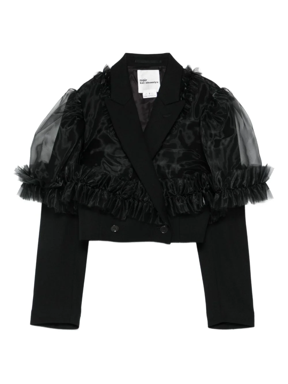 ruffle-trimmed jacket Highlights - Black - Organza sleeves - Ruffle trim - Cropped length - Double-breasted closure - Long sleeves Imported Composition Wool 100%, Polyester 100% SIZE & FIT Model measurements Height 5 ft 9 in(1.75 m) Bust/Chest 34.64 in(88 cm) Hips 36.61 in(93 cm) Waist 26.37 in(67 cm) Washing instructions Read Manufacturer Guidelines