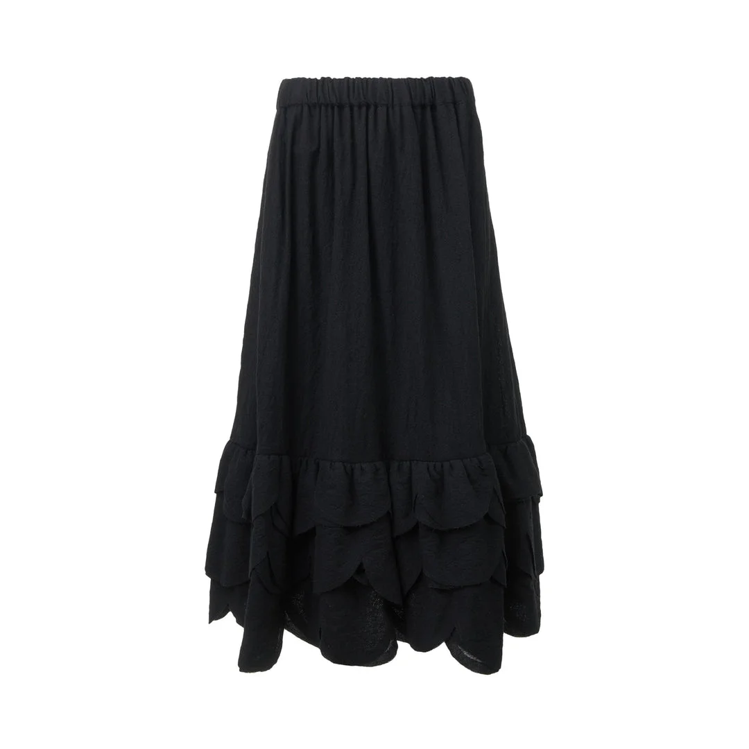 300049277BLK-MM / A53P-S007-051/00/black - Elastic waistband for comfortable fit - Multi-tiered ruffle construction - Milled wool-nylon blend fabric - A-line midi length silhouette - Textural layered hem detail - Relaxed fit through hips Noir Kei Ninomiya Wool Nylon Milled Skirt delivers avant-garde femininity with architectural construction and dramatic silhouette. Crafted from premium milled wool-nylon blend in deep black, featuring distinctive ruffled tiers and elastic waistband for comfortable wear. The voluminous A-line shape and textural layering create a signature statement piece that embodies the brand's deconstructed aesthetic.