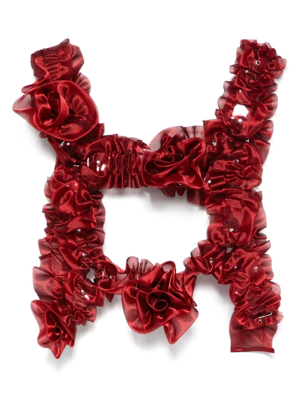 x Comme des Garcons flower-applique harness Highlights - Brick red - Adjustable shoulder straps - Ruffled detailing - Ring hardware detailing Imported Composition Polyurethane 100%, Polyester 100% SIZE & FIT Model measurements Height 5 ft 9 in(1.75 m) Bust/Chest 31.88 in(81 cm) Hips 34.64 in(88 cm) Waist 24.01 in(61 cm) FittingInformation Designed for a slim fit that sits just away from the body offering a close yet comfortable fit The belt offers adjustability for fitted preferences Made from a midweight non-stretch fabric Washing instructions Do Not Wash/Do Not Dry Clean