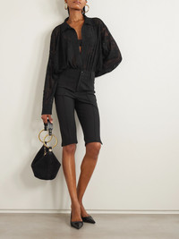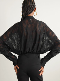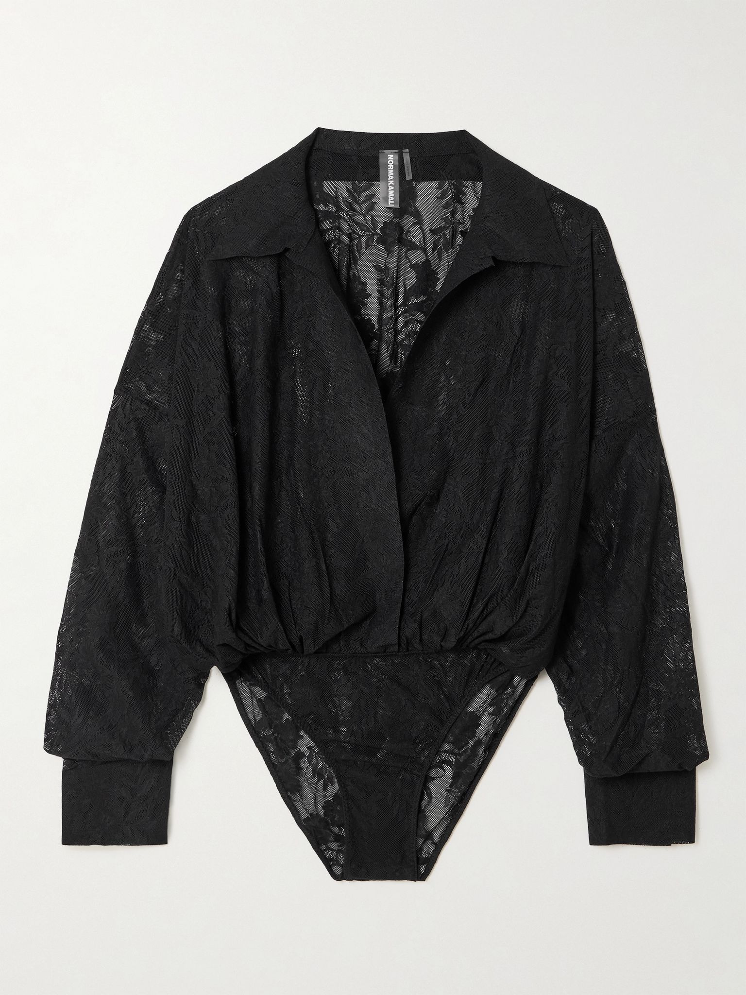Norma Kamali's bodysuit is made from stretch-lace featuring pretty floral motifs. It has a loose shape with dramatically dropped shoulders and full-coverage briefs that ensure a perfectly tucked look without any fuss. Underpin yours with a bralette to temper the sheerness and plunging neckline. Size & Fit - Fits true to size, take your normal size - Intended to be fitted at the hip with a loosely cut top - Full brief coverage - Lightweight, stretchy fabric - Model is 180cm/ 5'11" and is wearing a size XSmall Model measurements: - Bust: 80cm/ 31.5" - Waist: 65cm/ 25.5" - Hip: 89cm/ 35" Details & Care - Black stretch-lace - Snap fastenings at base - 81% nylon, 19% spandex - Machine wash