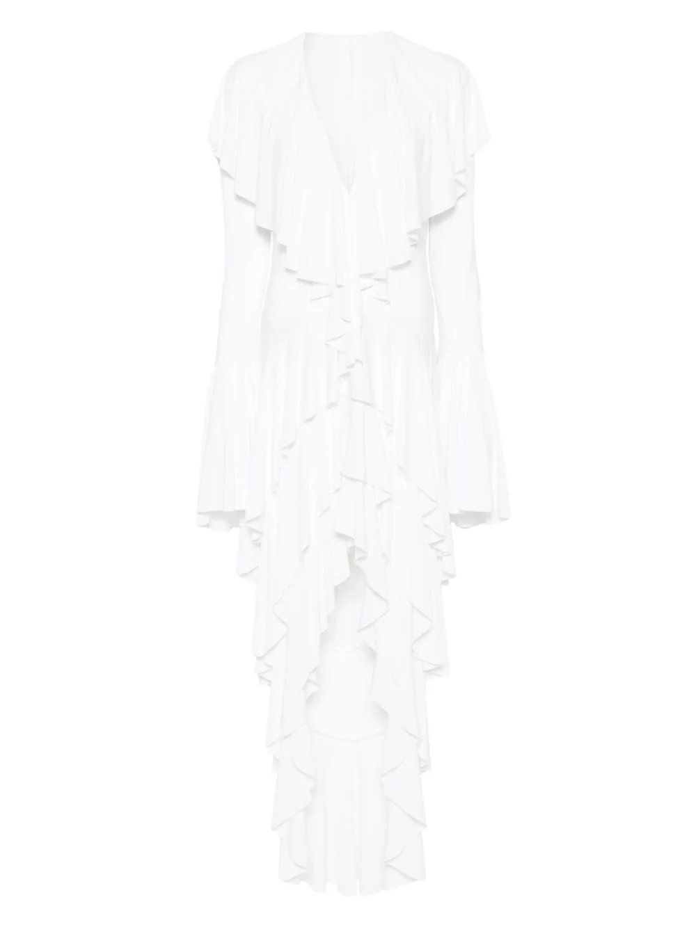 asymmetric long-sleeve dress Highlights - White - Ruffled detailing - Tiered skirt - Plunging v-neck Imported Composition Polyester 95%, Spandex/Elastane 5% SIZE & FIT Model measurements Height 5 ft 10 in(1.78 m) Bust/Chest 33.46 in(85 cm) Hips 36.22 in(92 cm) Waist 23.22 in(59 cm) FittingInformation Designed for a close fit throughout The internal briefs provide a close and supportive fit Made from a midweight stretch fabric, this piece offers elasticity and flexibility when worn Washing instructions Machine Wash
