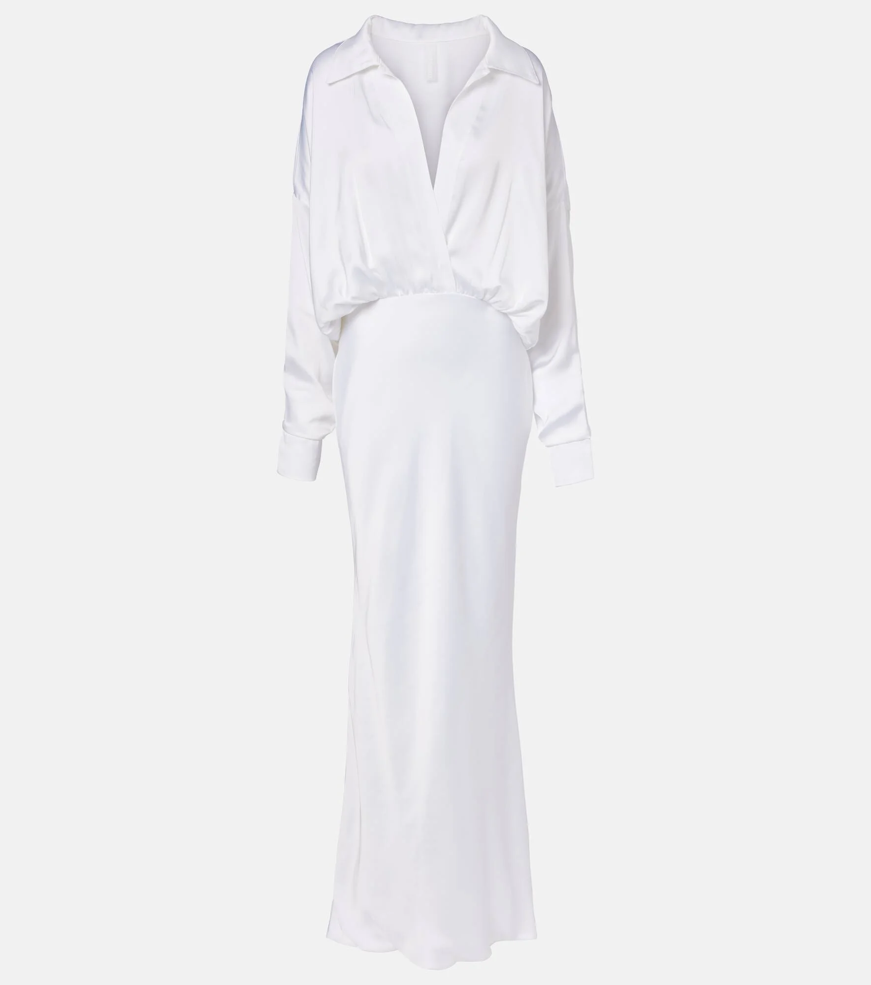 This oversized gown from Norma Kamali exudes sophistication with ease. The design features a classic shirt collar and plunging neckline, cinched at the waist with an elegant belt, before falling to a floor-length fishtail hem. Product Details - Material: 100% polyester - Care instructions: hand wash - Made in China - Designer color name: Snow White - Item color: white - Collar: one-piece - Item number: P01112342 Size & Fit - True to size - Shoulder pad inserts - Loose bodice, fitted skirt - Non-stretchy fabric - Height of model is 177cm-69.5" and wears a size XS