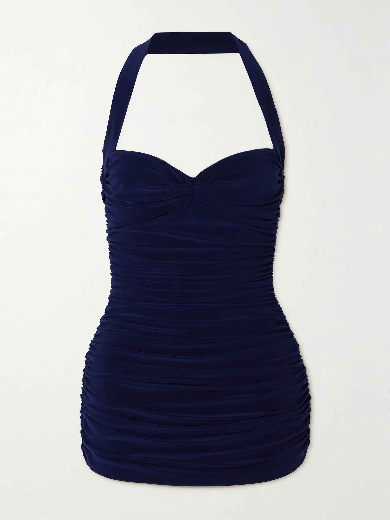 Norma Kamali's 'Bill Mio' halterneck swimsuit is inspired by glamorous pin-up styles. It's made from smoothing stretch fabric and tightly ruched throughout. Play into the retro feel with cat-eye sunglasses. Size & Fit - Fits true to size, take your normal size - Full brief coverage - Model is 180cm/ 5’11”, bra size 32B and is wearing a size Small Details & Care - Navy stretch-polyester - Pulls on - 95% polyester, 5% spandex - Machine wash - Lotion, sunscreen, oil and chlorine can cause discoloration of this item; this is not a manufacturing defect. Please follow care instructions to keep your swimwear in the best condition - To get the best from Norma Kamali swimwear, we advise that you rinse it in cold water immediately after swimming in chlorinated or salt water
