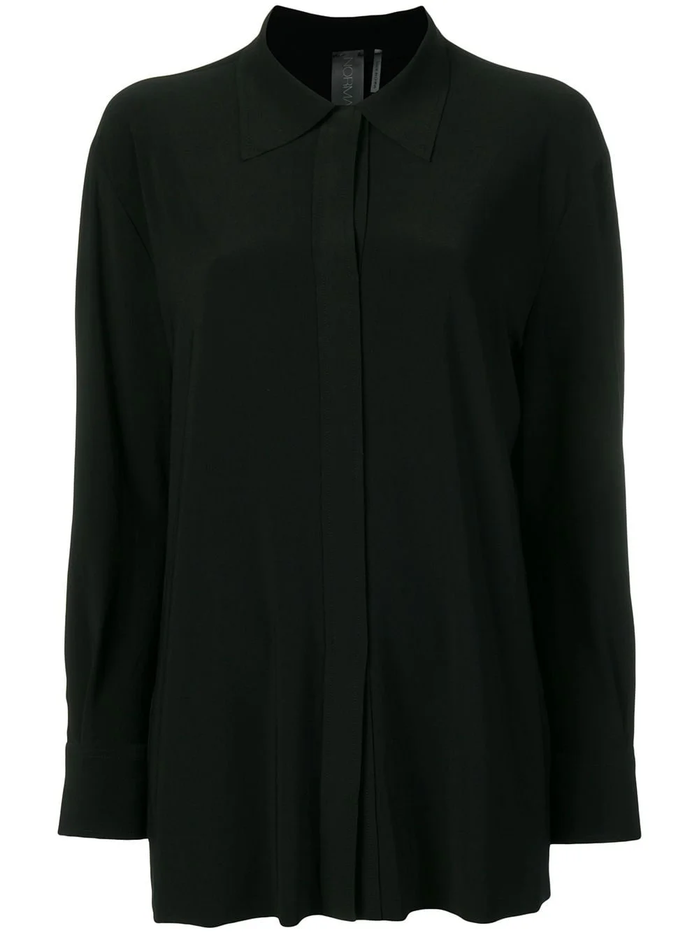 concealed fastened shirt Black concealed fastened shirt from Norma Kamali featuring a classic collar, a relaxed fit, stitching details, long sleeves and button cuffs. Imported Composition Polyester 95%, Spandex/Elastane 5% Washing instructions Hand Wash