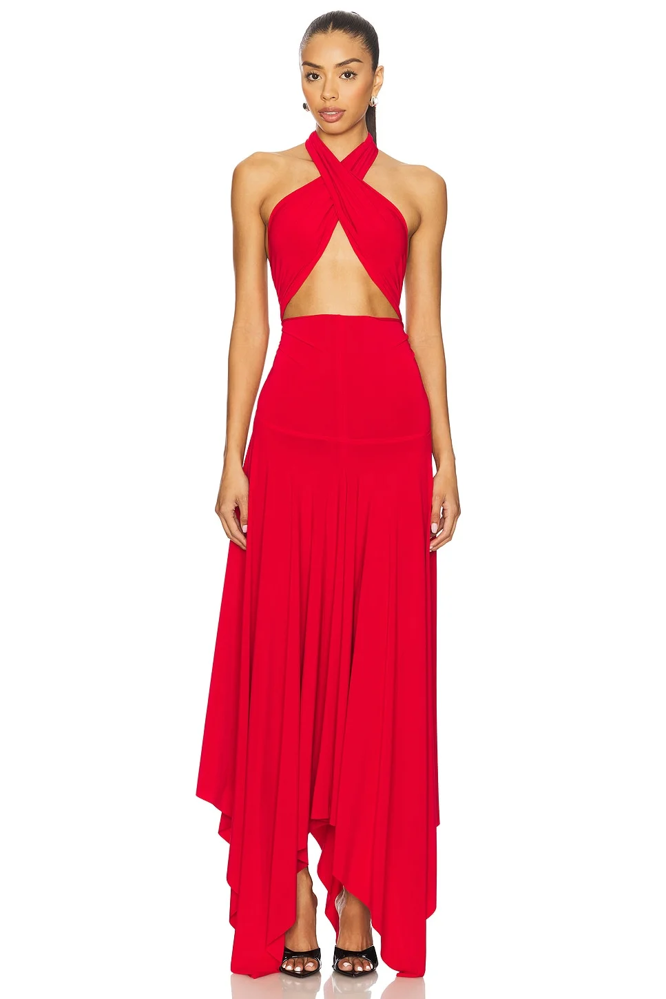 - 95% polyester 5% spandex - Machine wash cold - Unlined - Halterneck self-tie closure - Criss-cross styling at neckline - Midweight jersey fabric - style runs large, size down - Revolve Style No. NKAM-WD755 - Manufacturer Style No. KK2253PLO62946