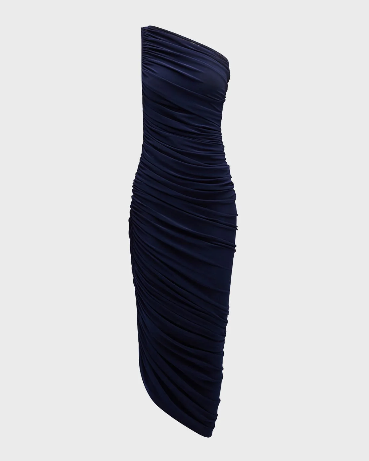 Norma Kamali "Diana" shirred dress features a builtin fourway stretch bodysuit for comfort and drape Oneshoulder neckline Sleeveless Asymmetric hem Full length Bodyconscious silhouette Slipover style Polyester/spandex Hand wash Imported