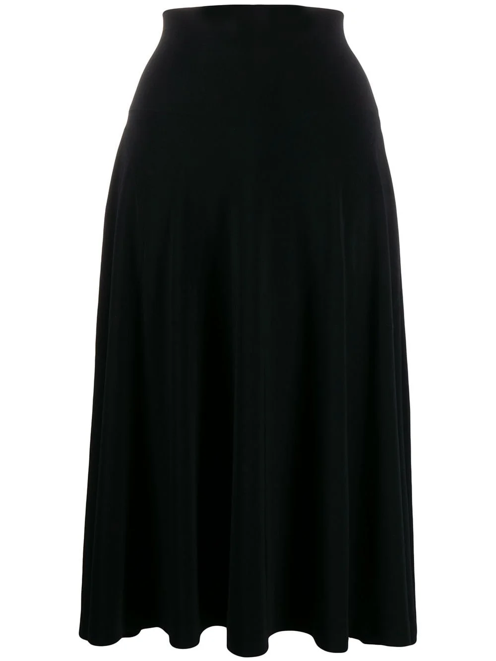 flared midi skirt Black flared midi skirt from Norma Kamali featuring a high waist. Imported Composition Polyester 95%, Spandex/Elastane 5% SIZE & FIT Model measurements Height 5 ft 11 in(1.8 m) Bust/Chest 31.49 in(80 cm) Hips 35.82 in(91 cm) Waist 24.8 in(63 cm) FittingInformation This piece fits true to size. We recommend you get your regular size Designed to be fitted at the waist, loose over the leg Made with a mid-weight stretch fabric Washing instructions Hand Wash