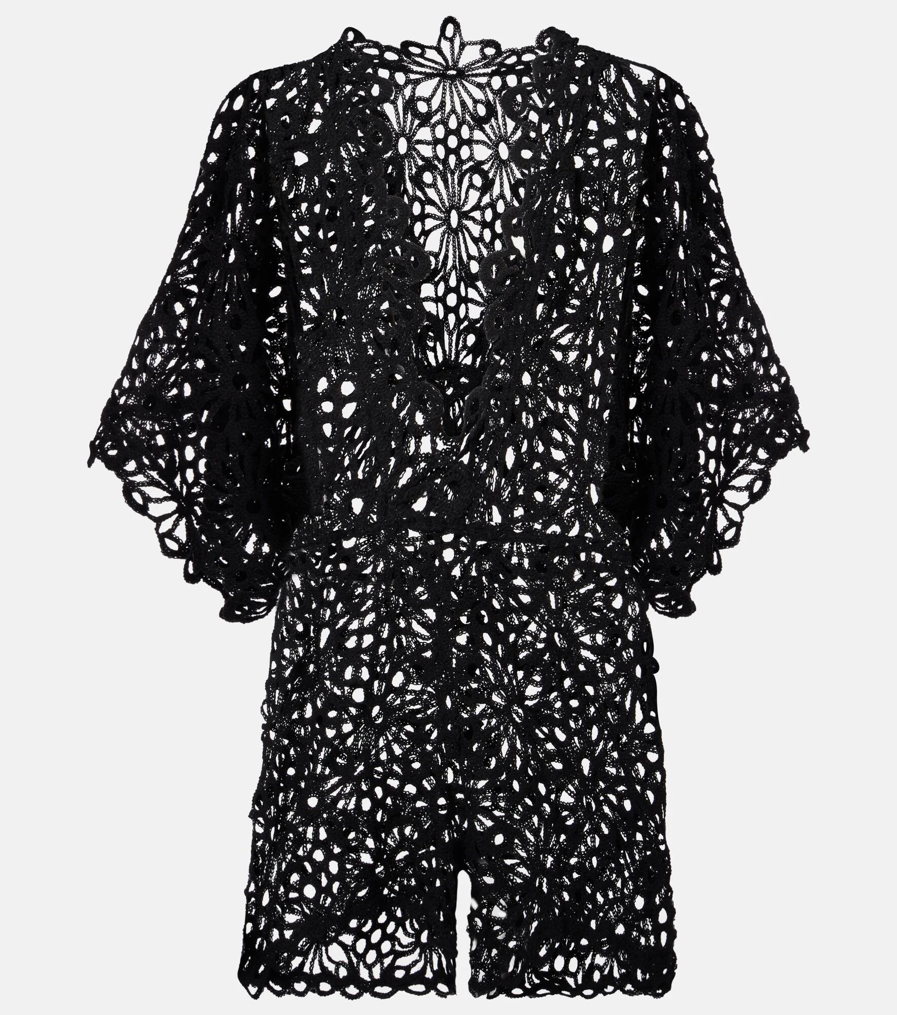 Award-winning designer Norma Kamali's playful approach to design has taken the world by storm since the 1960s. This romper is crafted from an open-knit floral pattern that lets your bathing suit peek through. Product Details - Material: 90% cotton, 10% nylon - Care instructions: hand wash - Made in China - Designer color name: Black - Item color: black - Item number: P01063771 Size & Fit - True to size - Sheer - Cinched waist - Non-stretchy fabric - Wide-leg - The model seen in the picture is 178cm-5'10" and wearing a size XS