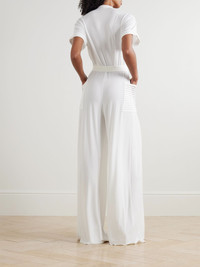Norma Kamali's 'Geralyn' jumpsuit has a semi-sheer striped mesh top contrasted by pleated pants made from jersey. It cinches in with a D-ring belt, accentuating its flowy wide legs. The notched collar is a cool little detail. Size & Fit - Fits true to size, take your normal size - Designed to be slightly fitted at the bust and waist - Mid-weight, stretchy fabric - Model is 177cm/ 5'10" and is wearing a size XSmall Model measurements: - Bust: 77cm/ 30.5" - Waist: 62cm/ 24.5" - Hip: 88cm/ 34.5" Details & Care - White jersey and mesh - Concealed VELCRO® fastening at front - 95% polyester, 5% spandex; trim: 100% polyester - Machine wash - Designer color: Snow White