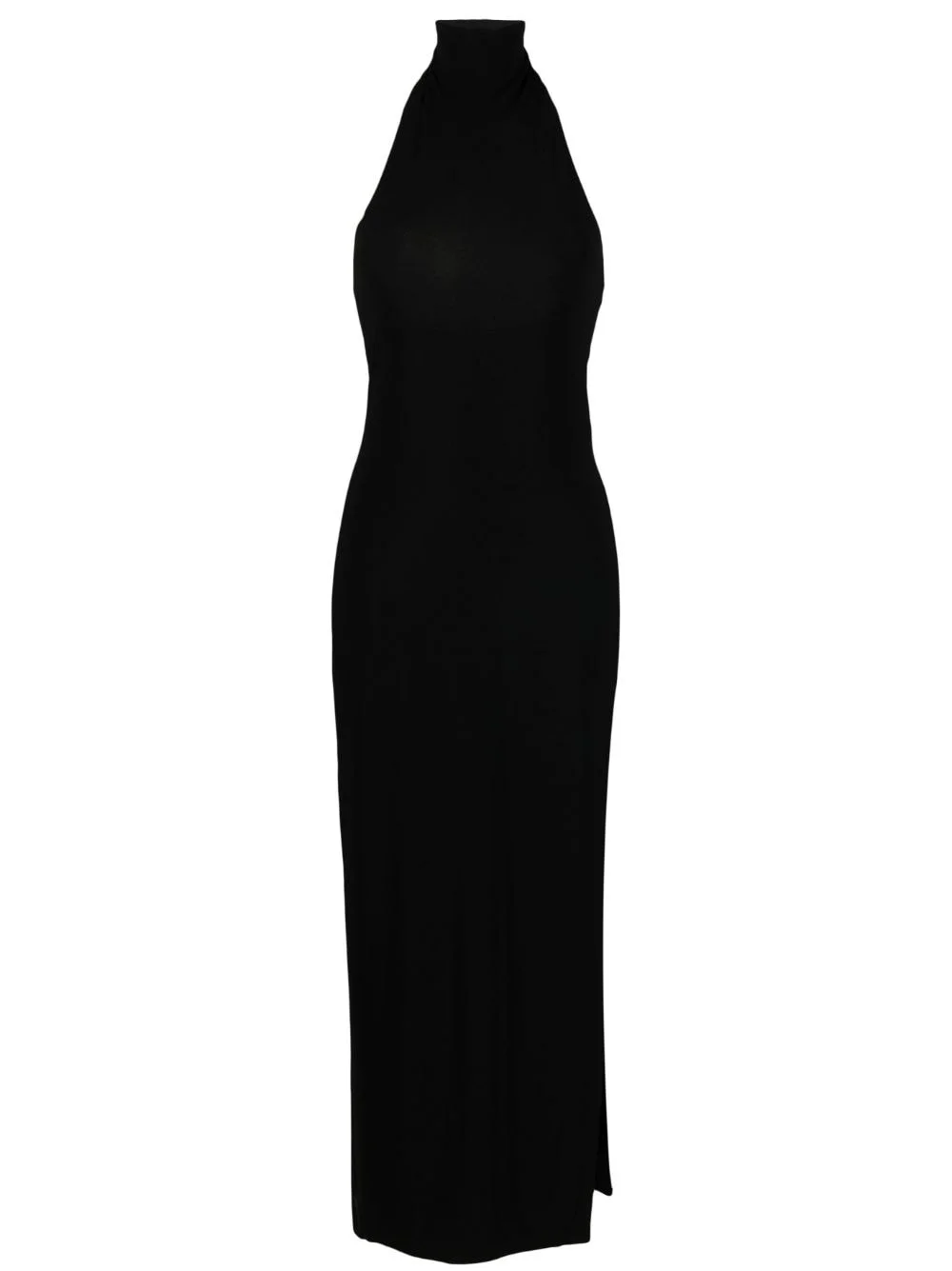 side-slit detail halter dress Highlights - Black - Side slits - Halterneck - Sleeveless - Long length - Straight hem Imported Composition Polyester 95%, Spandex/Elastane 5% SIZE & FIT Model measurements Height 5 ft 10 in(1.77 m) Bust/Chest 29.92 in(76 cm) Hips 34.25 in(87 cm) Waist 23.62 in(60 cm) Measurement HIPS 16.53 in(42 cm) LENGTH 51.18 in(130 cm) WAIST 12.99 in(33 cm) FittingInformation This piece fits true to size. We recommend you get your regular size Designed to be fitted at the waist and hips, loose over the leg Made with a mid-weight stretch fabric Washing instructions Hand Wash