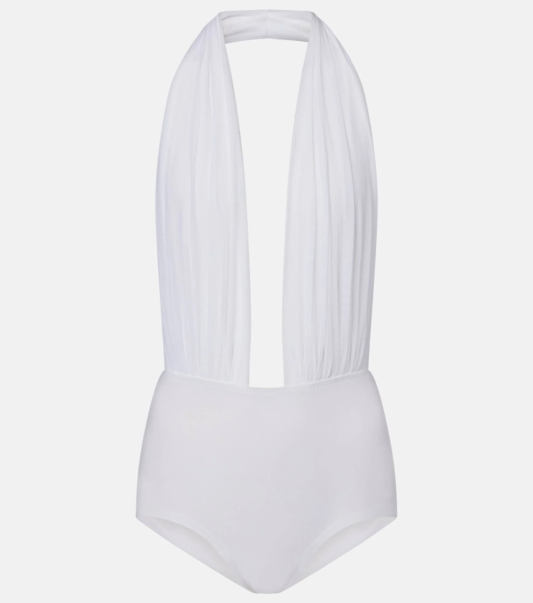 Award-winning designer Norma Kamali's playful approach to design has impressed fashion aficionados everywhere since the 1960s. This bodysuit has a halterneck front and a backless design. Product Details - Material: 95% polyester, 5% elastane - Care instructions: machine wash cold - Made in China - Designer color name: Snow White - Item color: white - Trim: 82% nylon, 18% elastane - Item number: P01063767 Size & Fit - True to size - Low back - Fitted - Stretchy fabric - Low-cut leg - The model seen in the picture is 178cm-5'10" and wearing a size XS