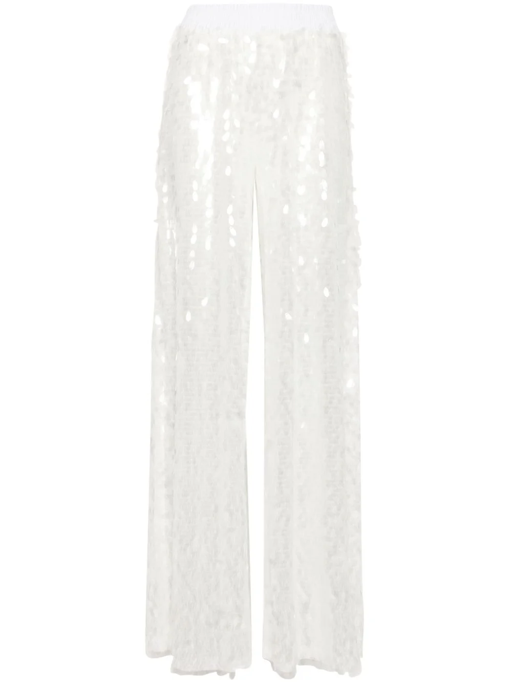 high-waist flared trousers Highlights - White - Mesh design - Paillette embellishment - High waist - Elasticated waistband - Wide leg - Flared hem Imported Composition Nylon 95%, Spandex/Elastane 5% Washing instructions Hand Wash
