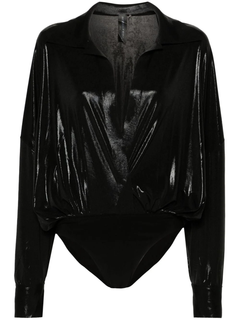 laminated shirt-style bodysuit Highlights - Black - Laminated finish - Gathered detailing - Spread collar - Open front - Drop shoulder - Long sleeves - Just a reminder that this piece must be tried on over your own garments. Imported Composition Polyester 95%, Spandex/Elastane 5% SIZE & FIT Model measurements Height 5 ft 10 in(1.78 m) Bust/Chest 31.49 in(80 cm) Hips 37 in(94 cm) Waist 23.62 in(60 cm) FittingInformation Designed for a loose fit at the chest and waist with a close fit at the hips Made from a lightweight stretch fabric, this piece offers elasticity and flexibility when worn This piece fits true to size – take your usual size