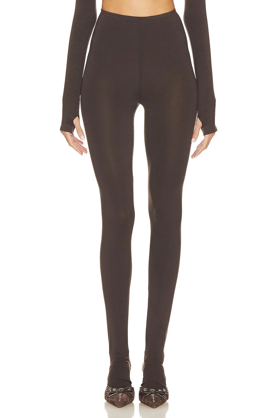 - Elevate your cozy style with Norma Kamali's Chocolate Legging With Footie - These high-waisted leggings offer both comfort and style, perfect for lounging in luxury - .95% viscose 5% spandex - Made in China - Hand wash - Pull-on styling with elastic waistband - Lightweight slinky jersey fabric - Stirrup cuffs.8" at the knee and 8" at the leg opening - style runs large, size down - Revolve Style No. NKAM-WP181 - Manufacturer Style No. ST3237MD876028