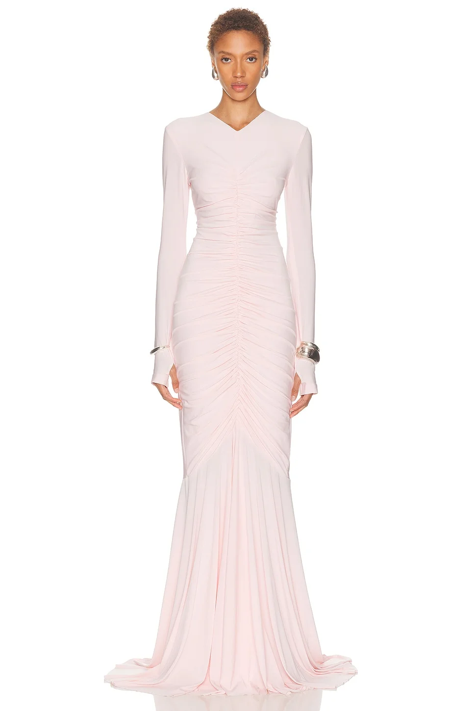 Long Sleeve V Neck Shirred Front Fishtail Gown