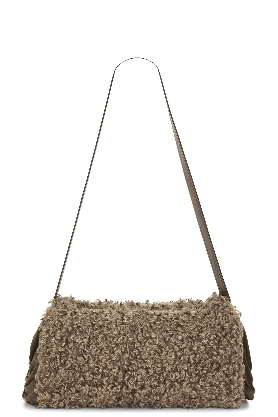 - Faux fur exterior with faux leather trim and textile lining - Top zipper closure - One main compartment - Arm cuffs at sides for hand warmth - Integrated faux leather shoulder strap - style runs large, size down - Measures approx 15" W x 7.5" H x 7.5" D Shoulder strap with a 16.5" drop - Revolve Style No. NKAM-WY2 - Manufacturer Style No. ST325GCUR16867