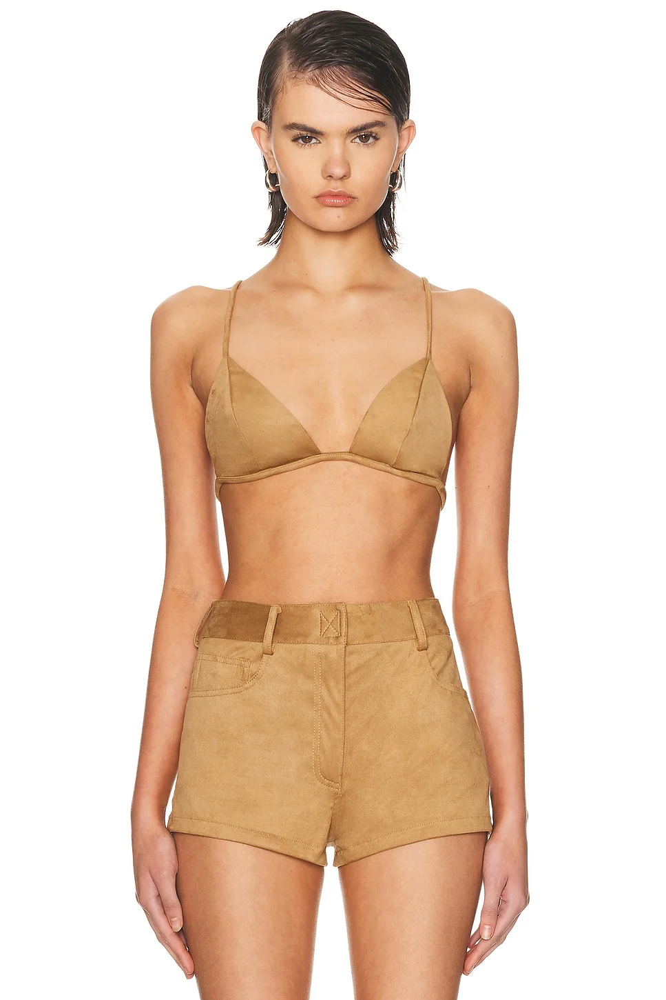 Details - Shell: 93% polyester, 7% elastane - 95% polyester, 5% elastane - Made in China - Hand wash cold - Tie-closure - Criss-cross back - Triangle bikini bra - Brown brushed synthetic fabric - style runs large, size down - Our Style No. NOMF-WS244 - Manufacturer Style No. ST425YSUS64870