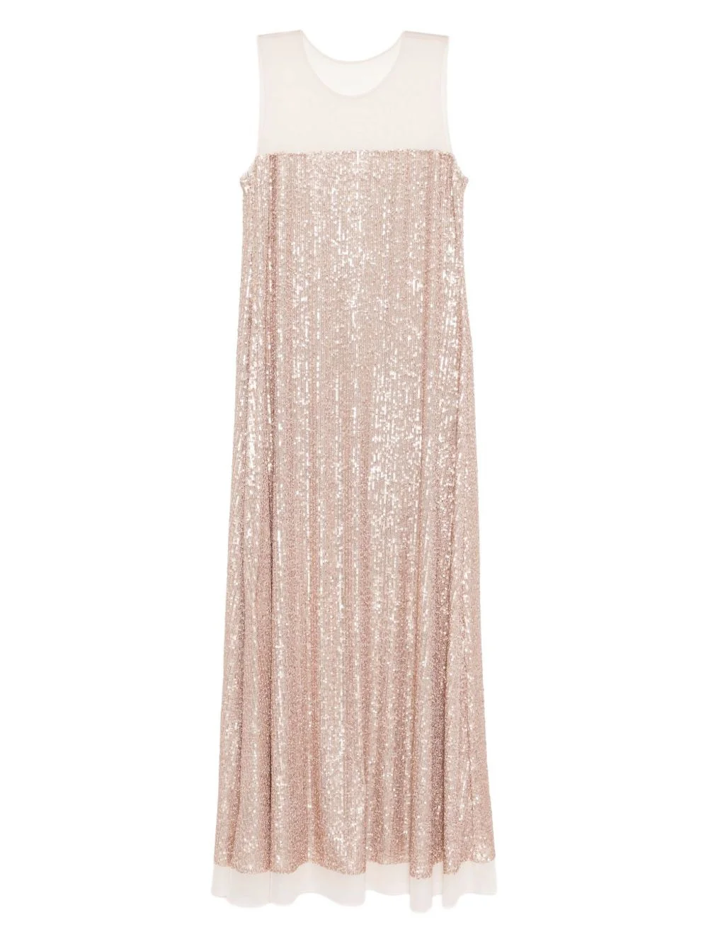 sleeveless maxi dress Highlights - Beige - Round neck - Mesh panelling - Sequin detailing Imported Composition Polyester 95%, Elastane 5% SIZE & FIT Model measurements Height 5 ft 10 in(1.78 m) Bust/Chest 31.88 in(81 cm) Hips 37 in(94 cm) Waist 25.19 in(64 cm) FittingInformation Designed for a slim fit that sits just away from the body offering a close yet comfortable fit Made from a midweight stretch fabric, this piece offers elasticity and flexibility when worn Washing instructions Dry Clean Only