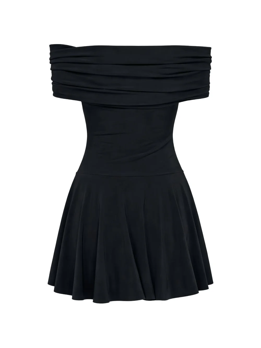 off-shoulder mini dress Highlights - Black - Off-shoulder style - Draped detailing - Short sleeves - Flared skirt Imported Composition Polyester 95%, Spandex/Elastane 5% Washing instructions Read Manufacturer Guidelines
