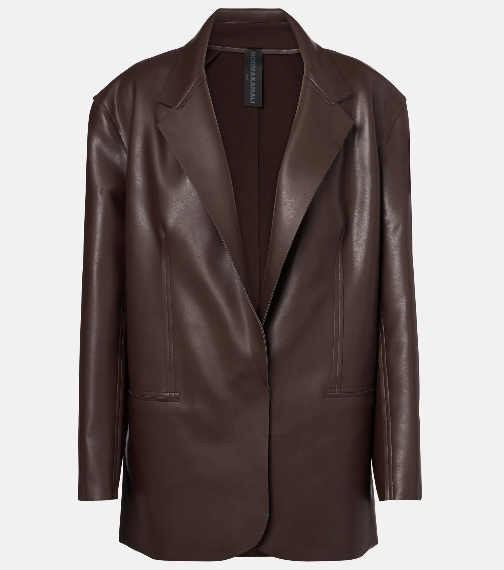 Award-winning designer Norma Kamali's playful approach to design has taken the world by storm since the 1960s. This blazer is crafted from faux leather and boasts an oversized fit. Pair with the matching miniskirt. Product Details - Material: 100% polyurethane - Care instructions: machine wash cold - Made in China - Designer color name: Choco - Item color: brown - Closure: VELCRO® fastening - Jacket construction: unstructured - Item number: P01063943 Size & Fit - Fits large to size - we recommend trying one size smaller - Loose fit, comes with belt - Non-stretchy fabric - Falls below the hip - The model seen in the picture is 178cm-5'10" and wearing a size XXS