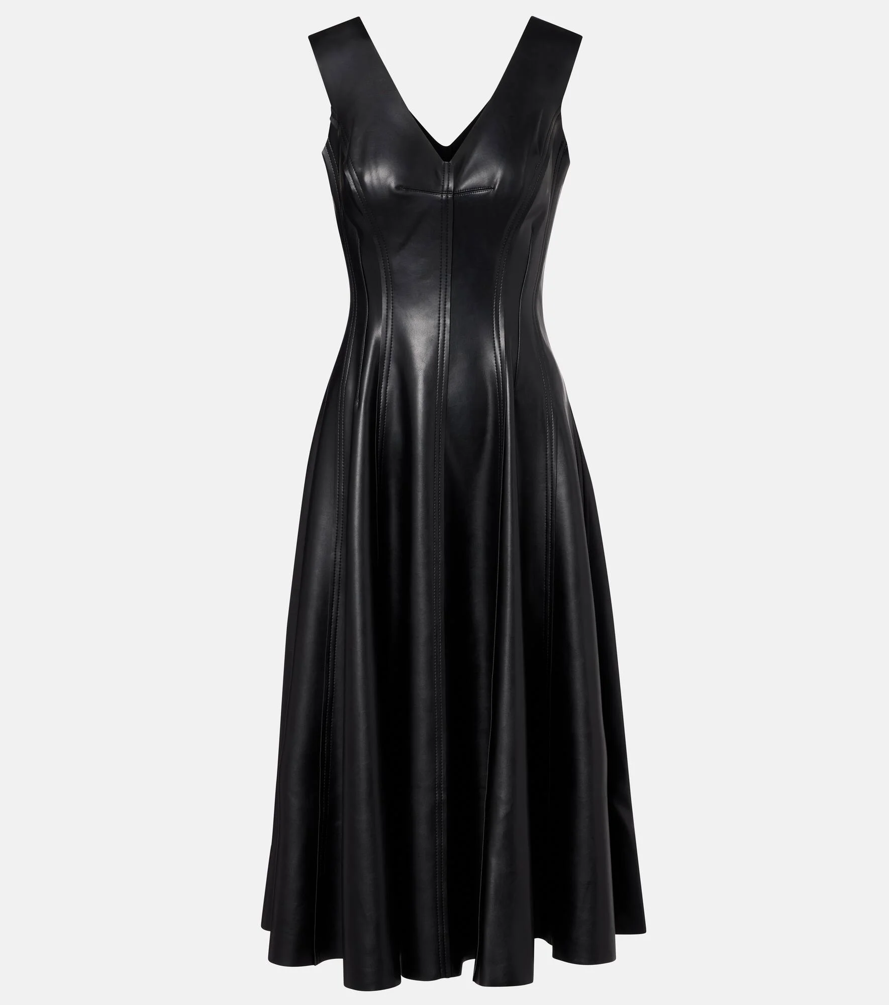 Award-winning designer Norma Kamali's playful approach to design has taken the world by storm since the 1960s. Tailored to an A-line silhouette with a flared skirt, this midi dress features a paneled design and a V-neckline. Product Details - Material: 100% polyurethane - Care instructions: hand wash cold - Made in China - Designer color name: Black - Item color: black - Material II: 95% polyester, 5% elastane - Material III: 95% polyester, 5% elastane - Collar: V-neck - Closure: concealed zipped side - Item number: P01112311 Size & Fit - True to size - Cinched waist - Stretchy fabric - The model seen in the picture is 178cm-5'10" and wearing a size XS