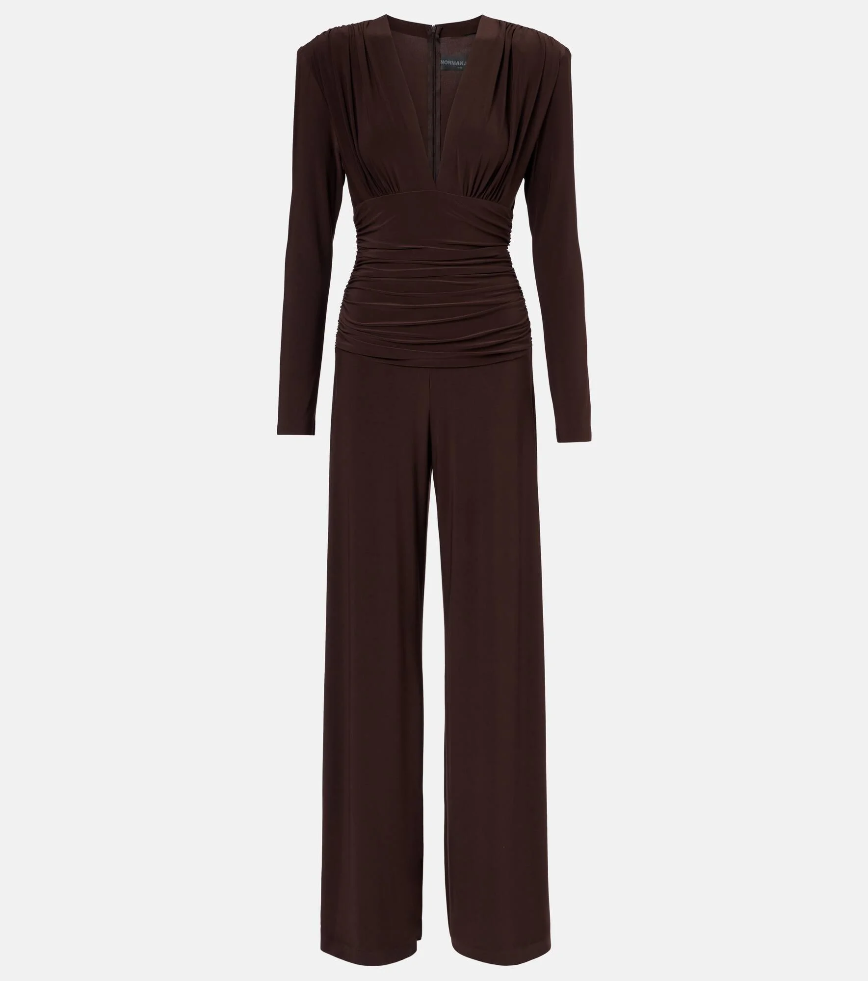 Award-winning designer Norma Kamali's playful approach to design has taken the world by storm since the 1960s. This jumpsuit is crafted from jersey with a ruched waist and is complete with pointed shoulders. Product Details - Material: 95% polyester, 5% elastane - Care instructions: machine wash cold - Made in China - Designer color name: Chocolate - Item color: brown - Closure: invisible zipper - Item number: P01054103 Size & Fit - True to size - Oversized shoulders - Shoulder pad inserts - Cinched waist - Stretchy fabric - Wide-leg - The model seen in the picture is 178cm-5'10" and wearing a size XS