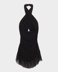 Norma Kamali ruched mesh swimdress Crisscross halter neckline Open back Flounce hem Slipover style Nylon/polyamide/elastane Hand wash Imported
