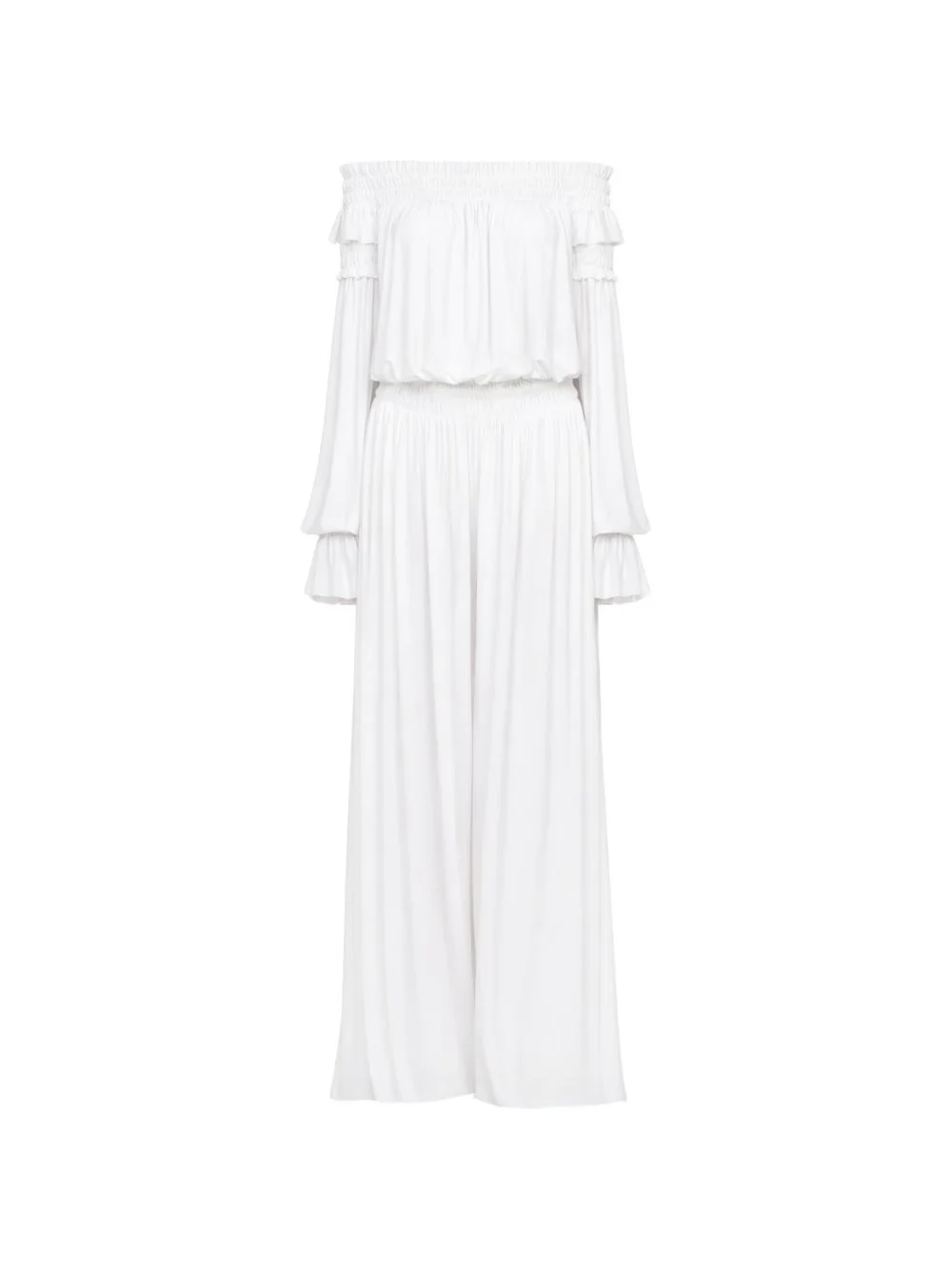 ruffled peasant trousers Highlights - White - Elasticated waist - Layered ruffles - Wide leg - Peasant style Imported Composition Polyester 95%, Elastane 5% Washing instructions Read Manufacturer Guidelines