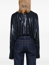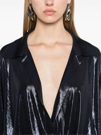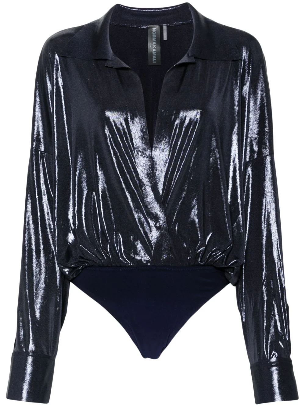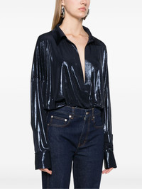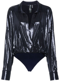 shirt bodysuit Highlights - Navy blue - Stretch-jersey - Lame effect - Shirt design - Front touch-strap fastening - Spread collar - Plunging v-neck - Drop shoulder - Long sleeves - Split cuffs - Gathered detailing - Just a reminder that this piece must be tried on over your own garments. Imported Composition Polyester 95%, Spandex/Elastane 5% SIZE & FIT Model measurements Height 5 ft 9 in(1.75 m) Bust/Chest 31.88 in(81 cm) Hips 34.64 in(88 cm) Waist 24.01 in(61 cm) FittingInformation Designed for a loose fit at the chest and waist with a close fit at the hips Made from a midweight stretch fabric, this piece offers elasticity and flexibility when worn Washing instructions Hand Wash