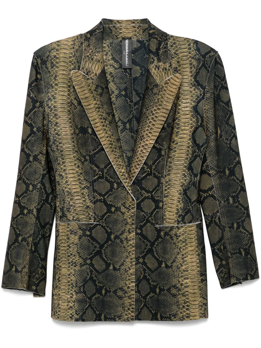 single-breasted blazer Highlights - Green - Two side slash pockets - Shoulder pads - Snakeskin print Imported Composition Polyester 95%, Spandex/Elastane 5% SIZE & FIT Model measurements Height 5 ft 10 in(1.79 m) Bust/Chest 31.88 in(81 cm) Hips 35.43 in(90 cm) Waist 23.62 in(60 cm) FittingInformation Designed for a slim fit that sits just away from the body offering a close yet comfortable fit The internal shoulder pads offer a structured shape Made from a midweight stretch fabric, this piece offers elasticity and flexibility when worn Washing instructions Machine Wash