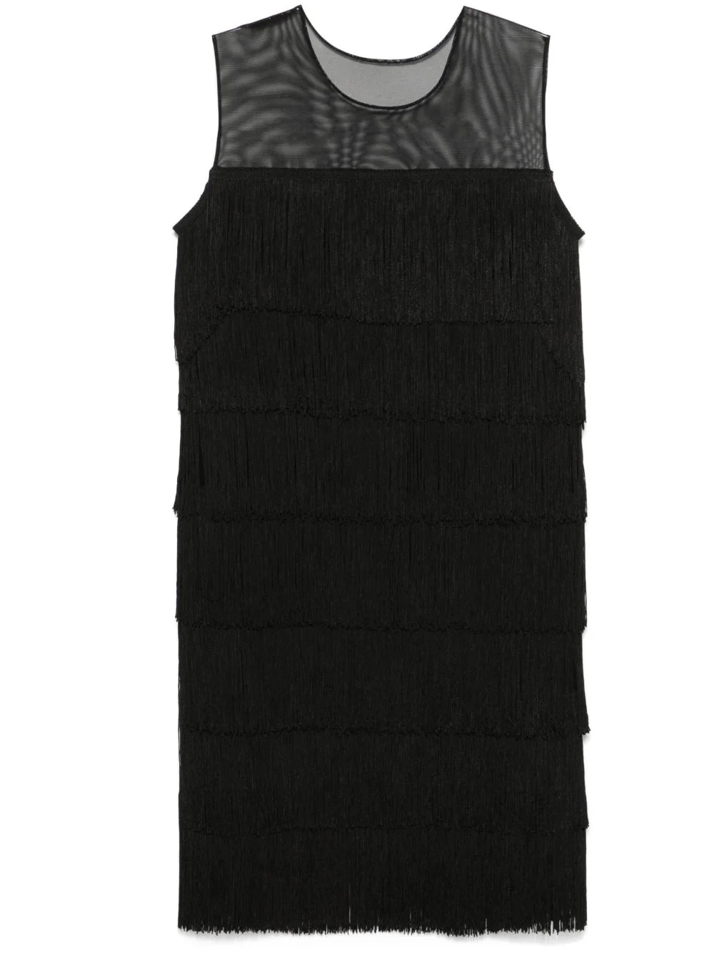 fringe sleeveless midi dress Highlights - Black - Stretch-design - Semi-sheer panels - Fringe detailing - Sleeveless - Round neck - Shift style - Fringed edge - Below-knee length Imported Composition Polyester 95%, Spandex/Elastane 5% SIZE & FIT Model measurements Height 5 ft 11 in(1.8 m) Bust/Chest 31.49 in(80 cm) Hips 36.61 in(93 cm) Waist 24.4 in(62 cm) FittingInformation Designed for a slim fit that sits just away from the body offering a close yet comfortable fit Made from a midweight stretch fabric, this piece offers elasticity and flexibility when worn