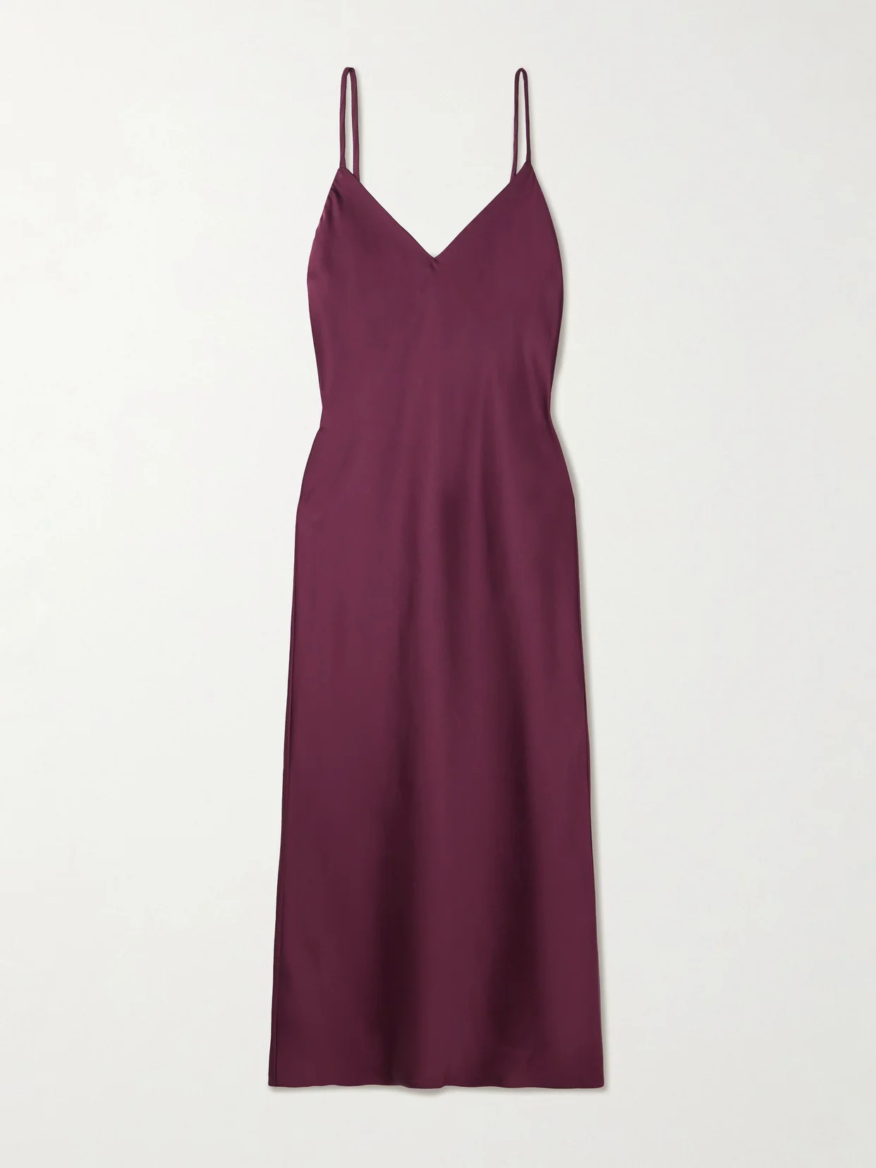 Norma Kamali's dress is minimally detailed with a floral applique for a romantic touch. Cut on the bias from lustrous satin, it has a V-neckline that's mirrored at the back and skims your figure all the way to the midi hem. Match your lipstick to the deep purple shade.