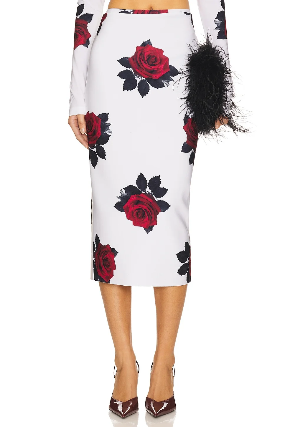- 95% polyester 5% spandex - Machine wash - Unlined - Pull-on styling with elastic waistband - Floral design throughout - Midweight crepe fabric - Item not sold as a set - Skirt measures approx 31" in length - style runs large, size down - Revolve Style No. NKAM-WQ83 - Manufacturer Style No. KK225SPLQ70340