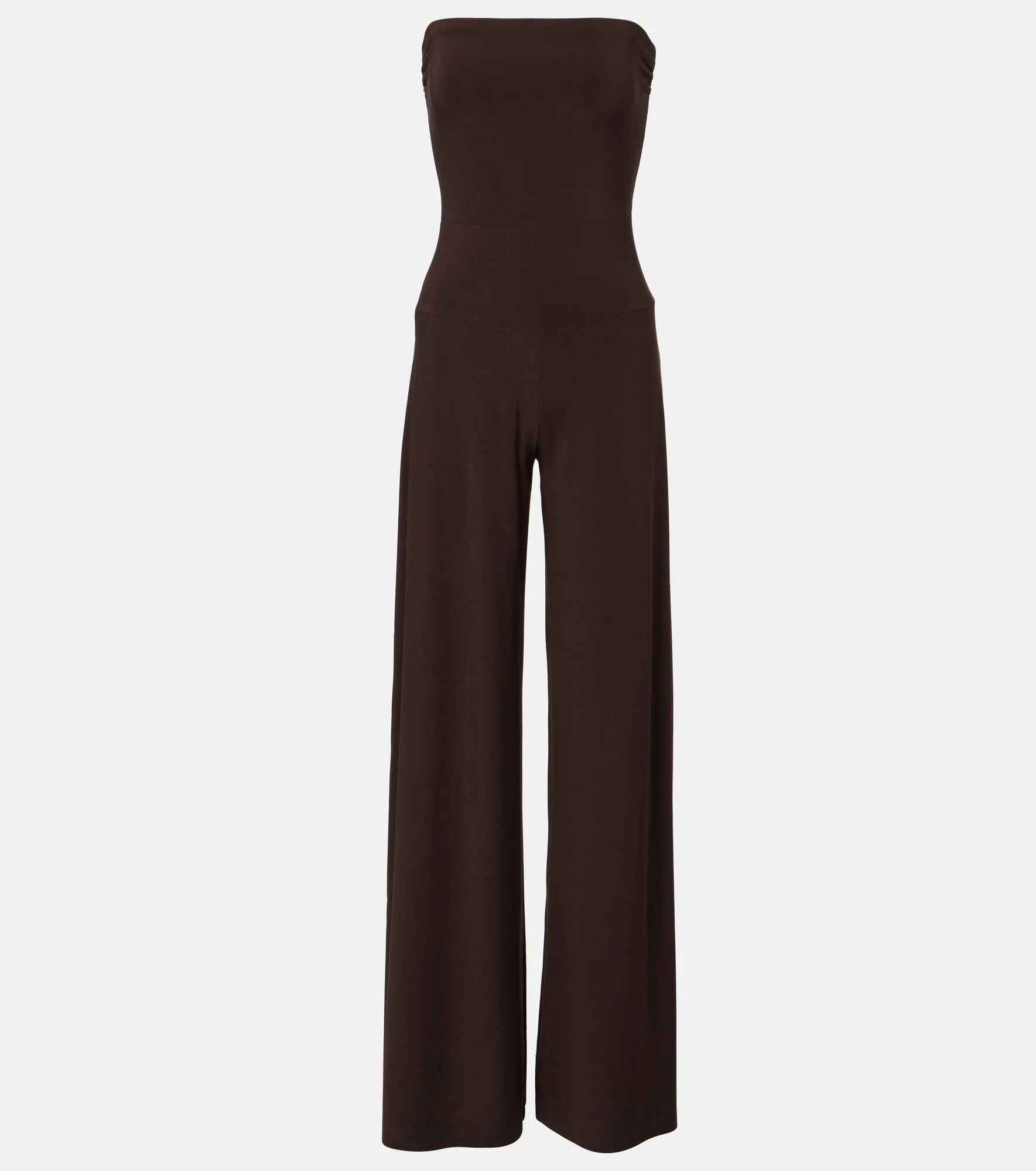 Award-winning designer Norma Kamali's playful approach to design has taken the world by storm since the 1960s. This jumpsuit is crafted from jersey and boasts a strapless neckline. Product Details - Material: 95% polyester, 5% elastane - Care instructions: machine wash cold - Made in China - Designer color name: Choco - Item color: brown - Item number: P01058623 Size & Fit - True to size - Strapless - Fitted - Stretchy fabric - Wide-leg - The model seen in the picture is 178cm-5'10" and wearing a size XS