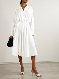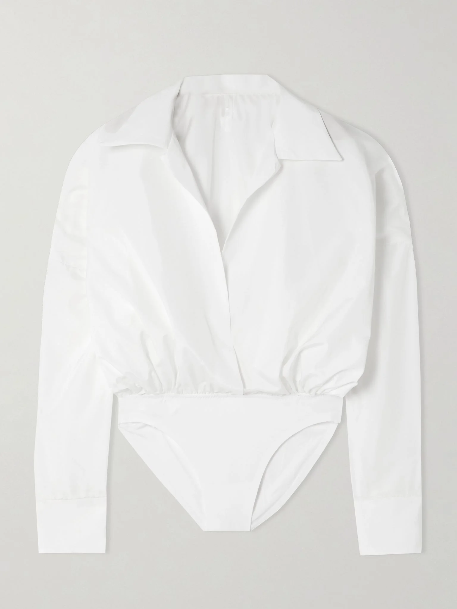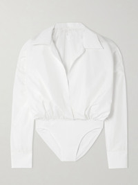 Norma Kamali's bodysuit is cut from crisp habotai in a relaxed, shirt-inspired shape. It has a deep V-neckline, billowy blouson sleeves and smooth stretch-jersey briefs. Style yours with everything from mini skirts to tailoring. Size & Fit - Fits true to size, take your normal size - Full brief coverage - Model is 177cm/ 5'10" and is wearing a size XSmall Model measurements: - Bust: 81cm/ 32" - Waist: 62cm/ 24.5" - Hip: 89cm/ 35" Details & Care - Off-white habotai - Concealed VELCRO® fastening at front - 100% polyester; trim: 95% polyester, 5% spandex - Machine wash - Designer color: Snow