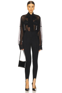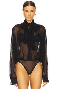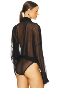 - 82% nylon 18% spandex - Made in China - Machine wash - Front tie at neckline and single velcro closure - Lightweight mesh fabric - Garment is intentionally sheer, undergarments will show through - Please note undergarment not included - style runs large, size down - Revolve Style No. NKAM-WS320 - Manufacturer Style No. ST424BMSC67001