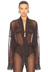Details - 82% nylon, 18% spandex - Made in China - Machine wash - Pull-on styling with front velcro closure - Mesh fabric with tie-up accent at neckline - Garment is intentionally sheer, undergarments will show through. - Please note undergarment not included - style runs large, size down - Our Style No. NOMF-WS196 - Manufacturer Style No. ST424BMSC67823