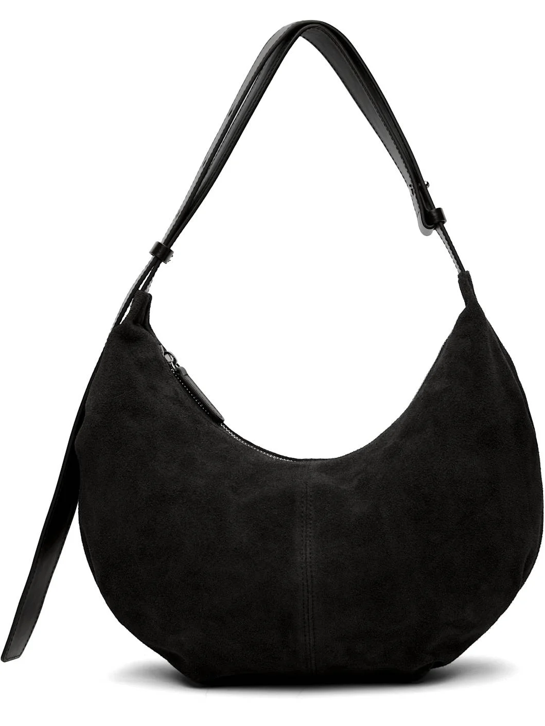 Suede shoulder bag. · Adjustable buffed leather shoulder strap · Pleats at sides · Zip closure · Zip pocket at interior · Cotton canvas lining · H9.5" x W13" x D2" Supplier color: Black Leather. Made in South Korea 252814F048004