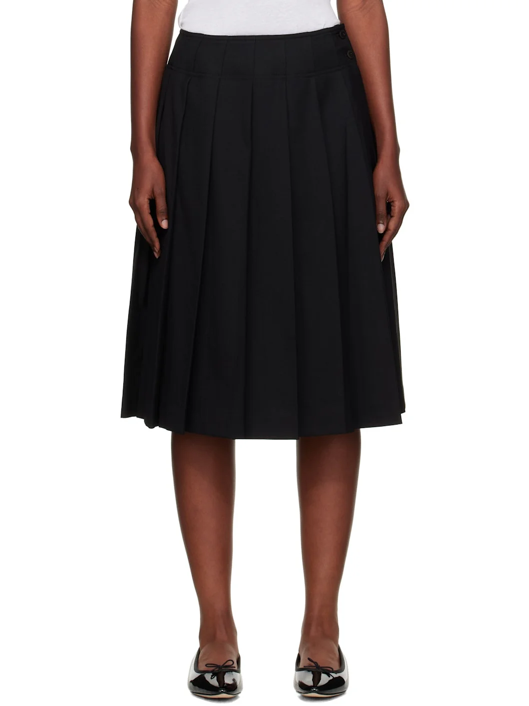 Wool-blend flannel midi skirt. · Pleats throughout · Two-pocket styling · Button fastening and zip closure at side seam · Full satin lining Supplier color: Black Body: 50% wool, 50% polyester. Lining: 50% viscose, 50% polyester. Made in South Korea 252814F090000