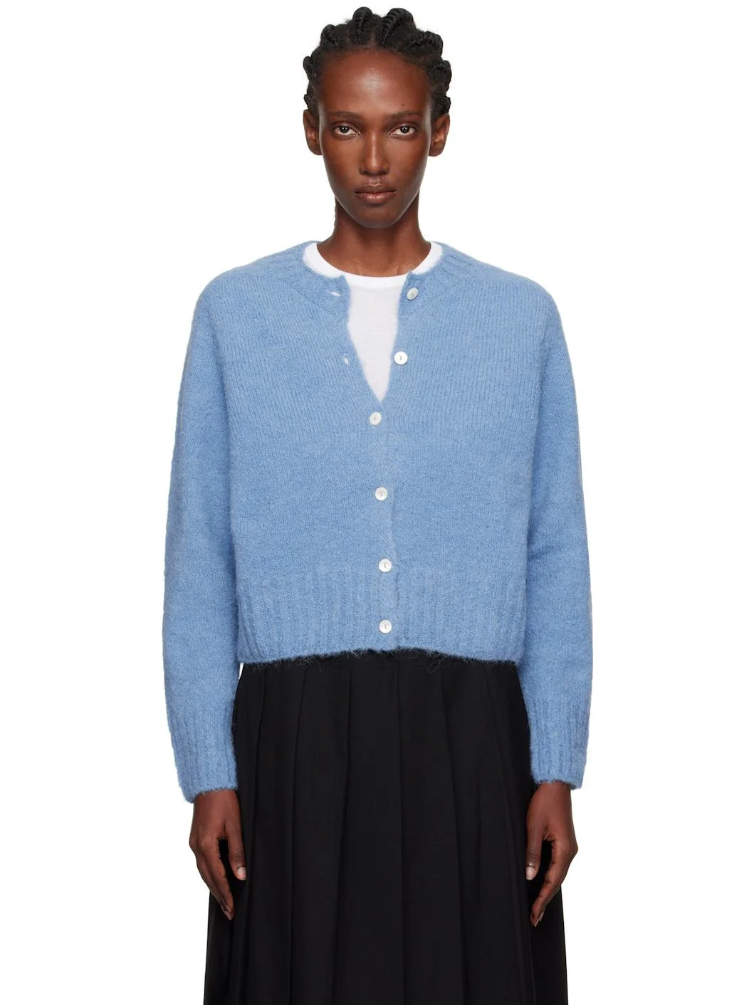 Brushed knit stretch alpaca-blend cardigan. · Rib-knit round neck, hem, and cuffs · Button closure Supplier color: Baby Blue 65% alpaca, 22% acrylic, 11% nylon, 2% polyurethane. Made in South Korea 252814F095000