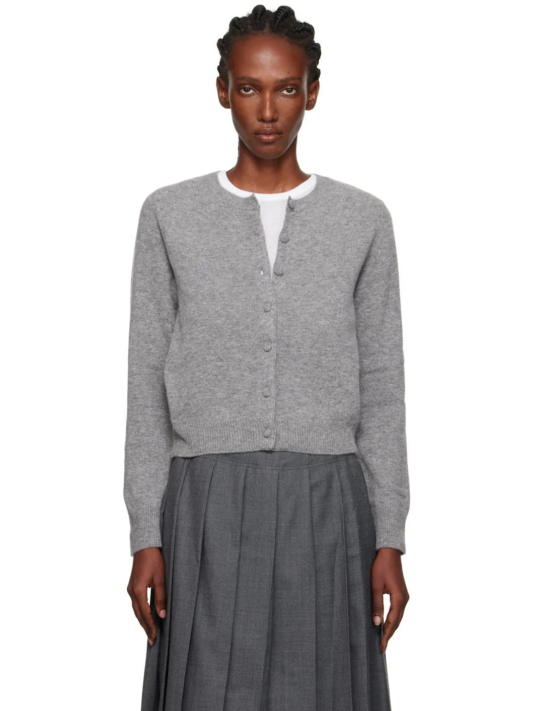 Knit wool- and cashmere-blend cardigan. · Rib-knit round neck, hem, and cuffs · Textile-covered button closure Supplier color: Gray 60% wool, 35% nylon, 5% cashmere. Made in South Korea 252814F095002